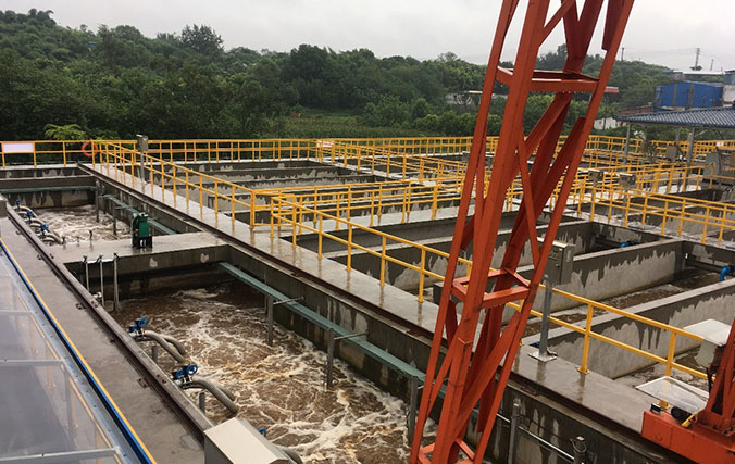本項目設(shè)計規(guī)模15000噸/天,分三期實施,一期新建日處理5000噸/天污水處理廠,深度處理工藝MBR系統(tǒng)設(shè)計一期處理規(guī)模為3000噸/天,污水處理主體工藝采用A2O+MBR,出水排放標(biāo)準(zhǔn)達(dá)到《四川省岷江、沱江流域水污染排放標(biāo)準(zhǔn)》(DB51/2311-2016)合格標(biāo)準(zhǔn)。項目選型為水藝SMU-30A產(chǎn)品,設(shè)計平均通量為13.35L/m2/h。項目設(shè)計2座膜池,每座膜池布置6個膜架,每個膜架52簾SMU-30A,共用膜面積9360平方。項目投運時間為2018年3月。