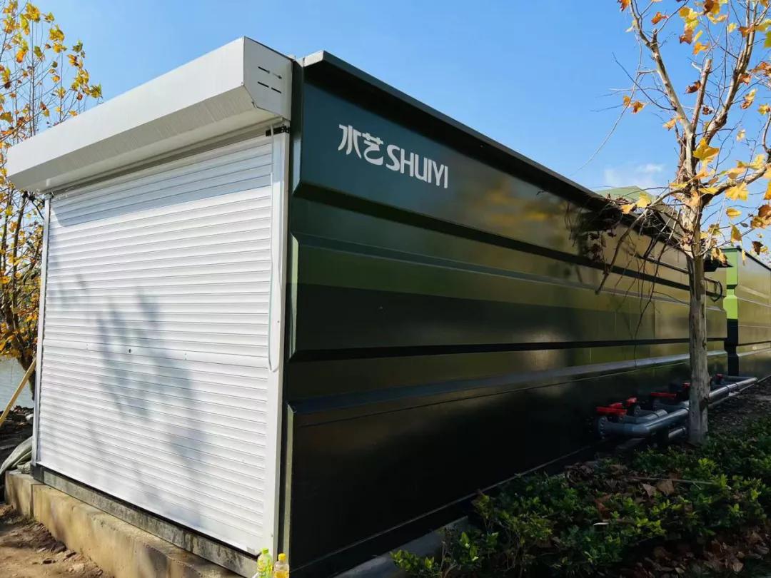此次安裝的初期雨水設(shè)備,采用的高效脫氮-超速凈化增氧裝備一體化污水處理工藝。由水泵將河水由提至高效生化脫氮一體機(jī)內(nèi),通過高效生化一體機(jī)內(nèi)的大量的馴化細(xì)菌,在兼氧、好氧微生物的新陳代謝作用下,去除污水中的各類污染物。然后將生化出水注入超速凈化一體機(jī),與除磷及絮凝藥劑充分混合,后經(jīng)沉淀作用使泥水分離,污泥進(jìn)入污泥池脫水減量化后外運(yùn)處置。為節(jié)約空間、減少運(yùn)行成本,此次設(shè)備采用一體化設(shè)備模塊式處理,在外觀上這兩臺設(shè)備更像兩個(gè)鐵皮箱,并對降低噪音作了優(yōu)化處理。