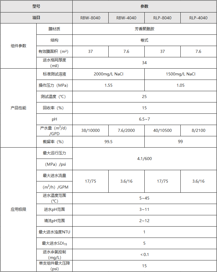 RLP系列:RLP是專門為去除無機鹽和有機小分子開發(fā)的反滲透膜,具有操作壓力低和脫鹽率高的特點,適用于較低鹽度原水的脫鹽處理。
